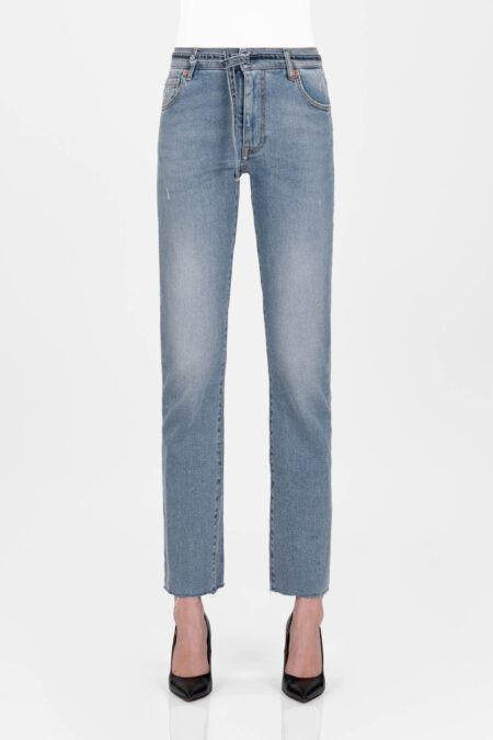 Un jeans slim modellante, con vita media e gamba super avvolgente, vestibiltร che esalta la silhouette femminile. Jeans personalizzato con il lettering Tramarossa applicato sullโetichetta posteriore in pelle suede, il tag T sulla tasca posteriore destra e il ricercato bottone gioiello.ย ย
