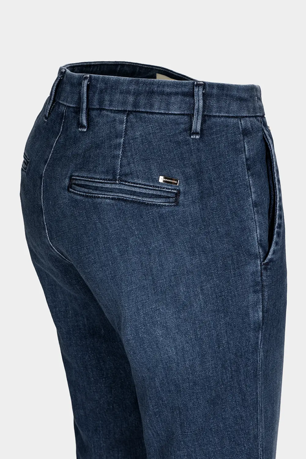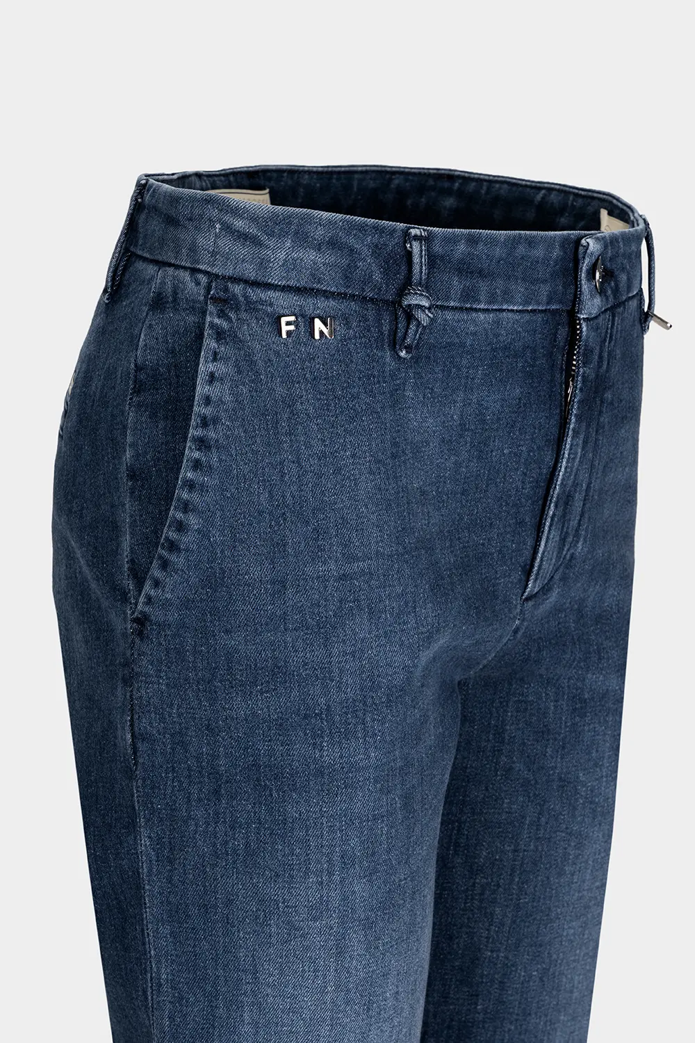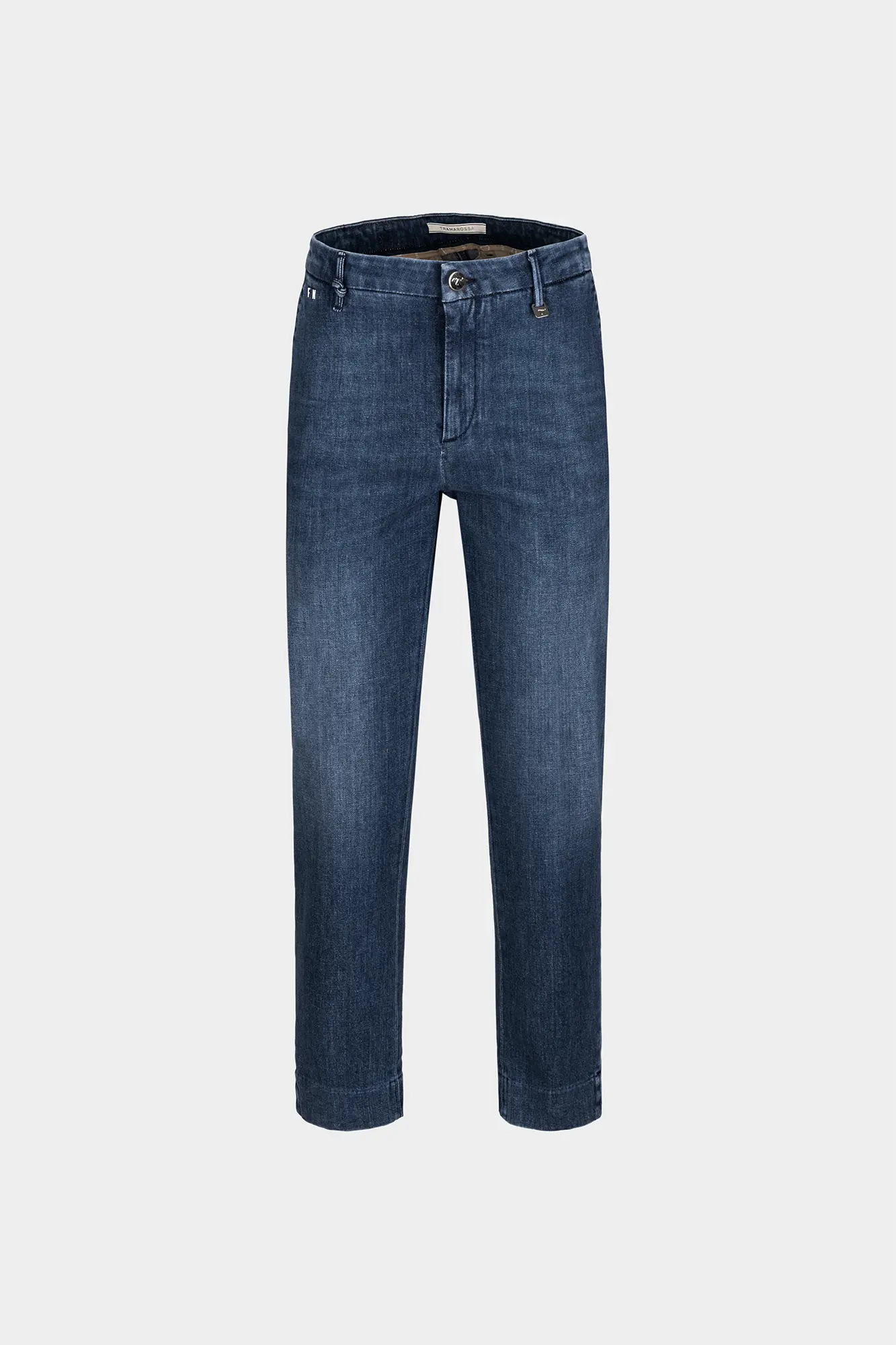 Interprete del modello chino, un pantalone sartoriale con tasca frontale taglio america e posteriore a soffietto. Realizzato in denim comfort in tono blue medio. Una scelta formale ed elegante, la gamba è dritta per una vestibilità regular. Rilassata sui fianchi e forma delicatamente affusolata lungo le gambe, arriva sopra le caviglie.