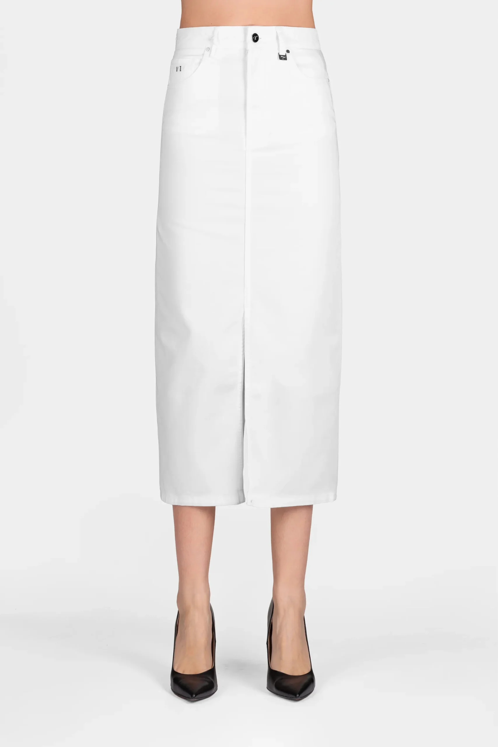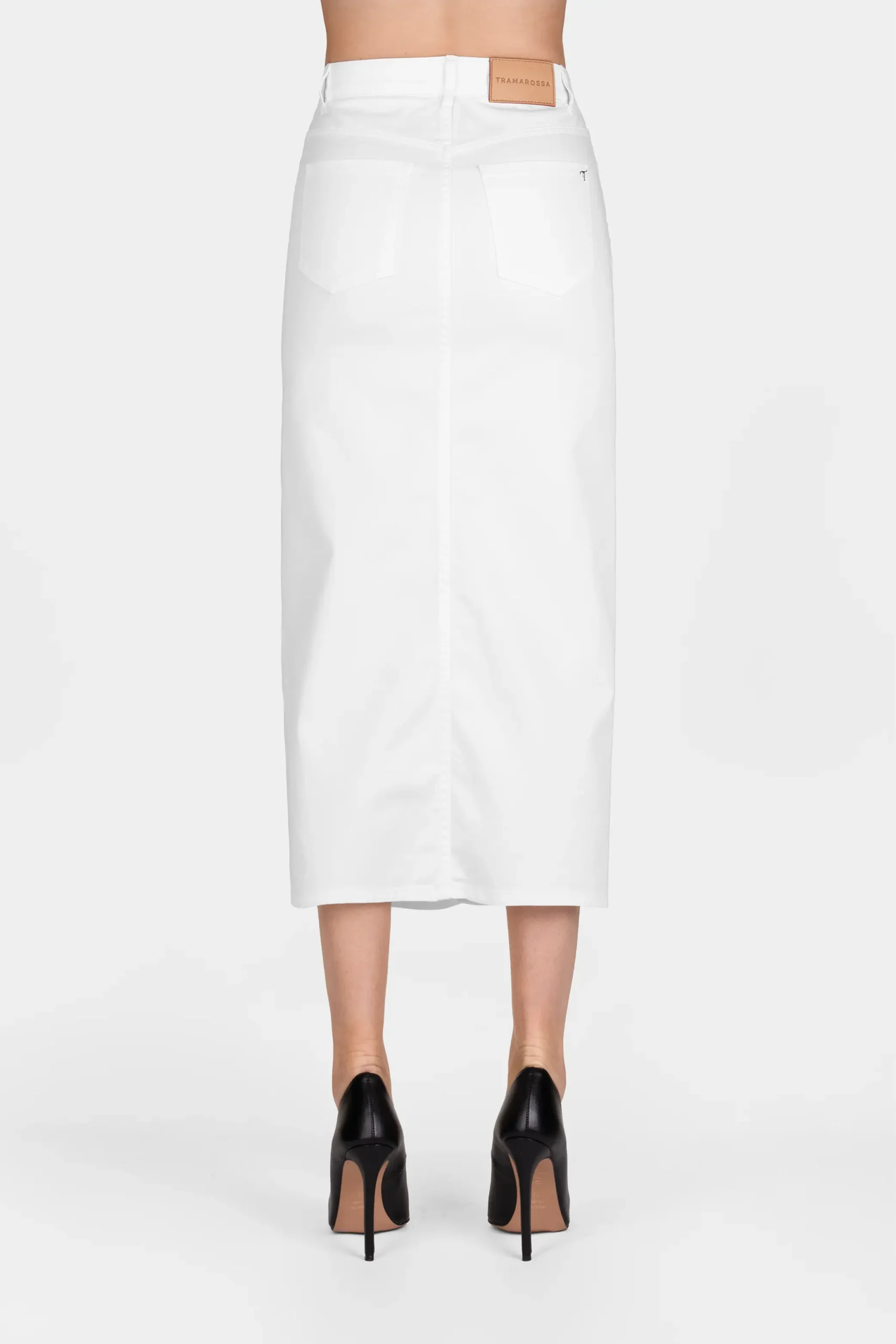 In una perfetta combinazione tra eleganza e linguaggio informale, la nuova gonna Tramarossa in denim ha la classica costruzione del cinque tasche con tasche applicate sul retro. Stretta su vita e cosce, esalta la silhouette femminile, scende con spacco frontale appena sopra il ginocchio.