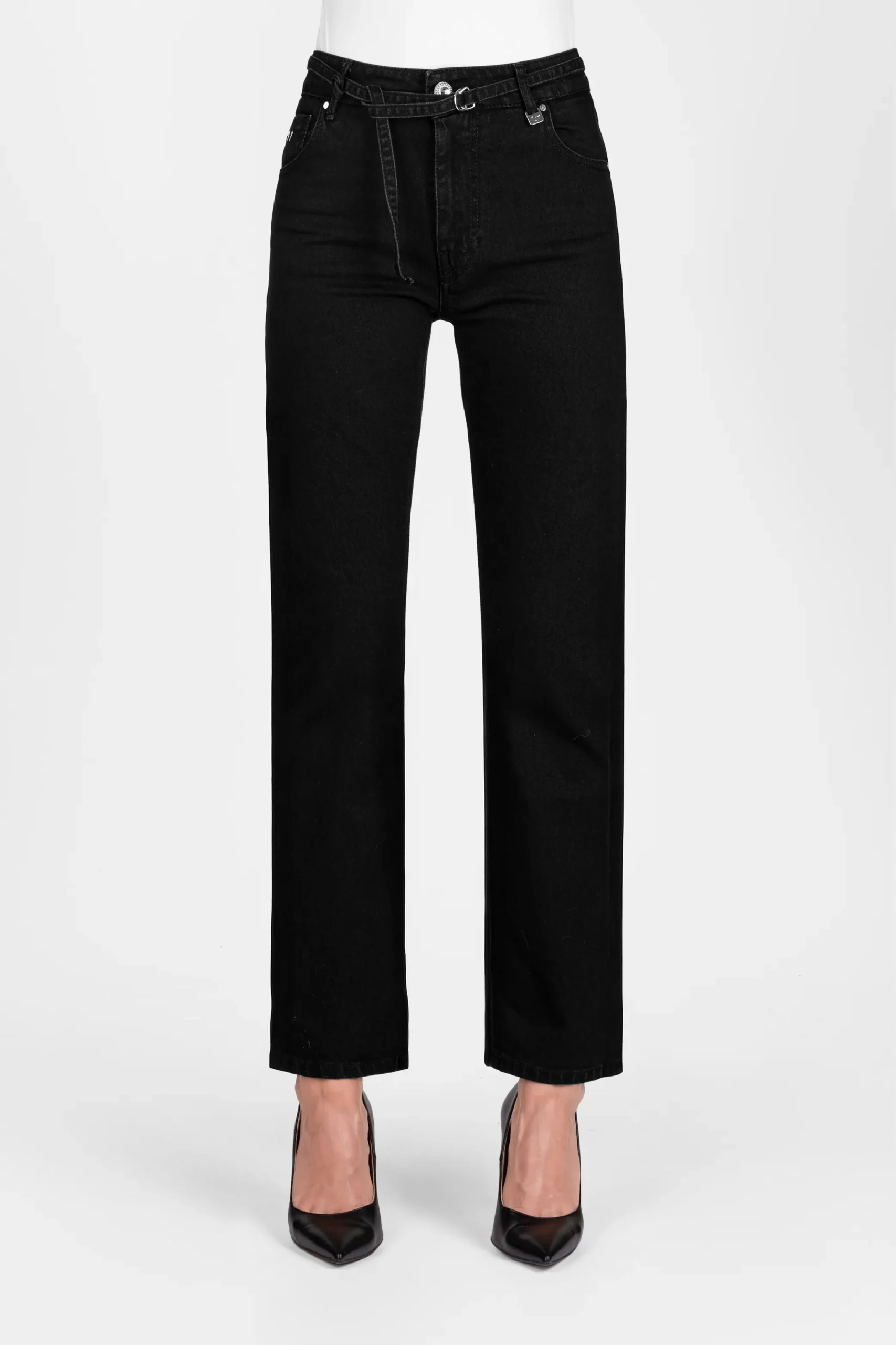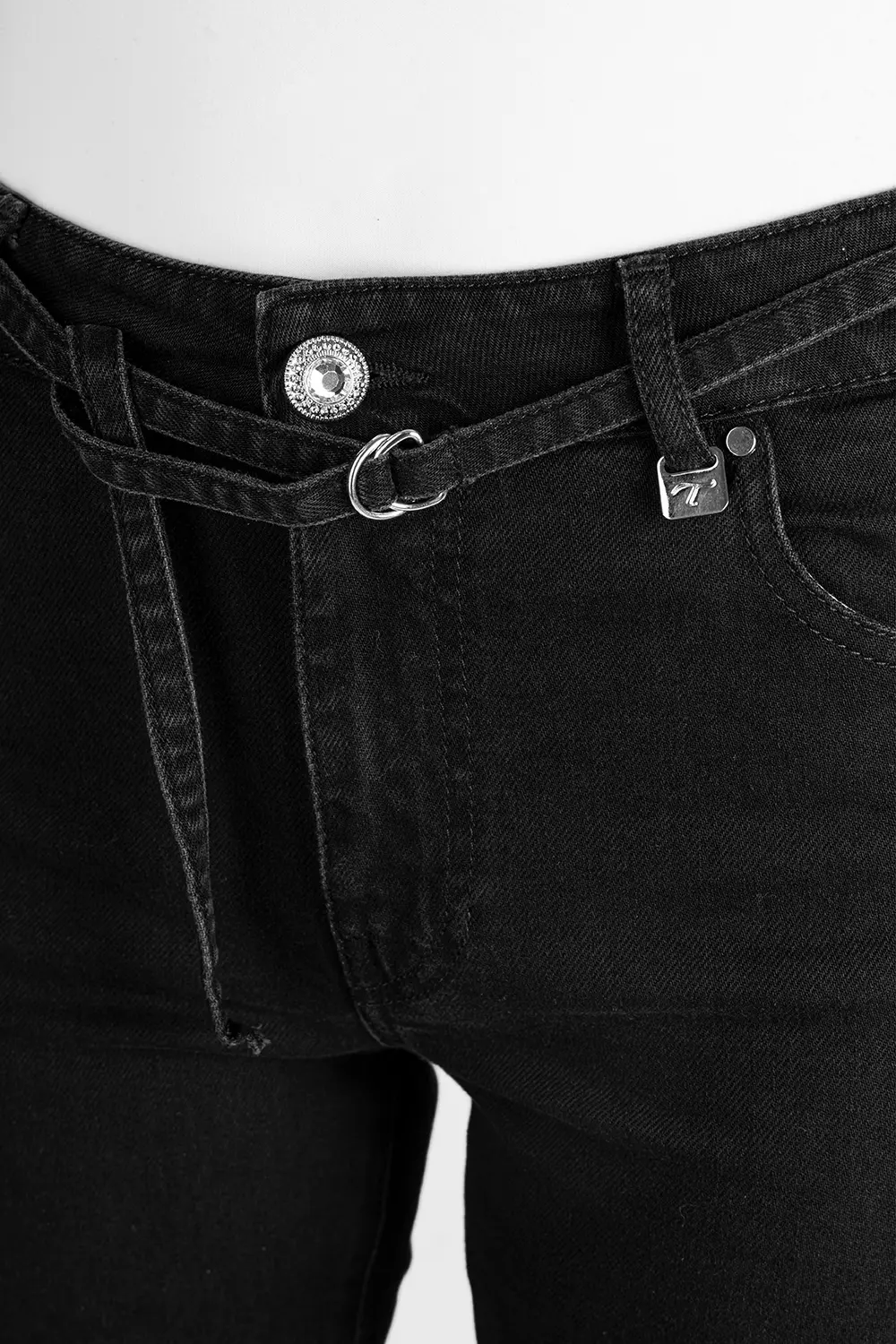 Jeans personalizzabile con le proprie iniziali. Iniziali Nikel lucido incluse. La modella è alta 1.75 e veste la taglia 27.