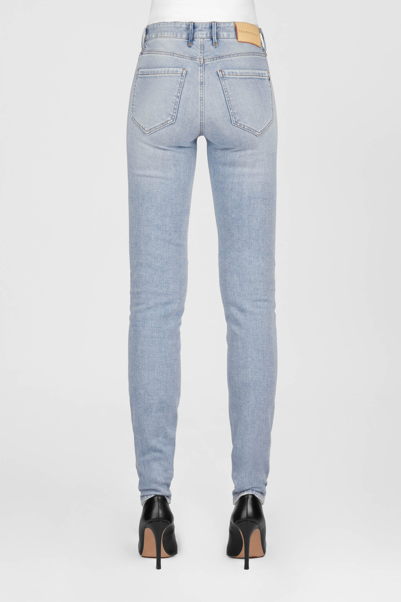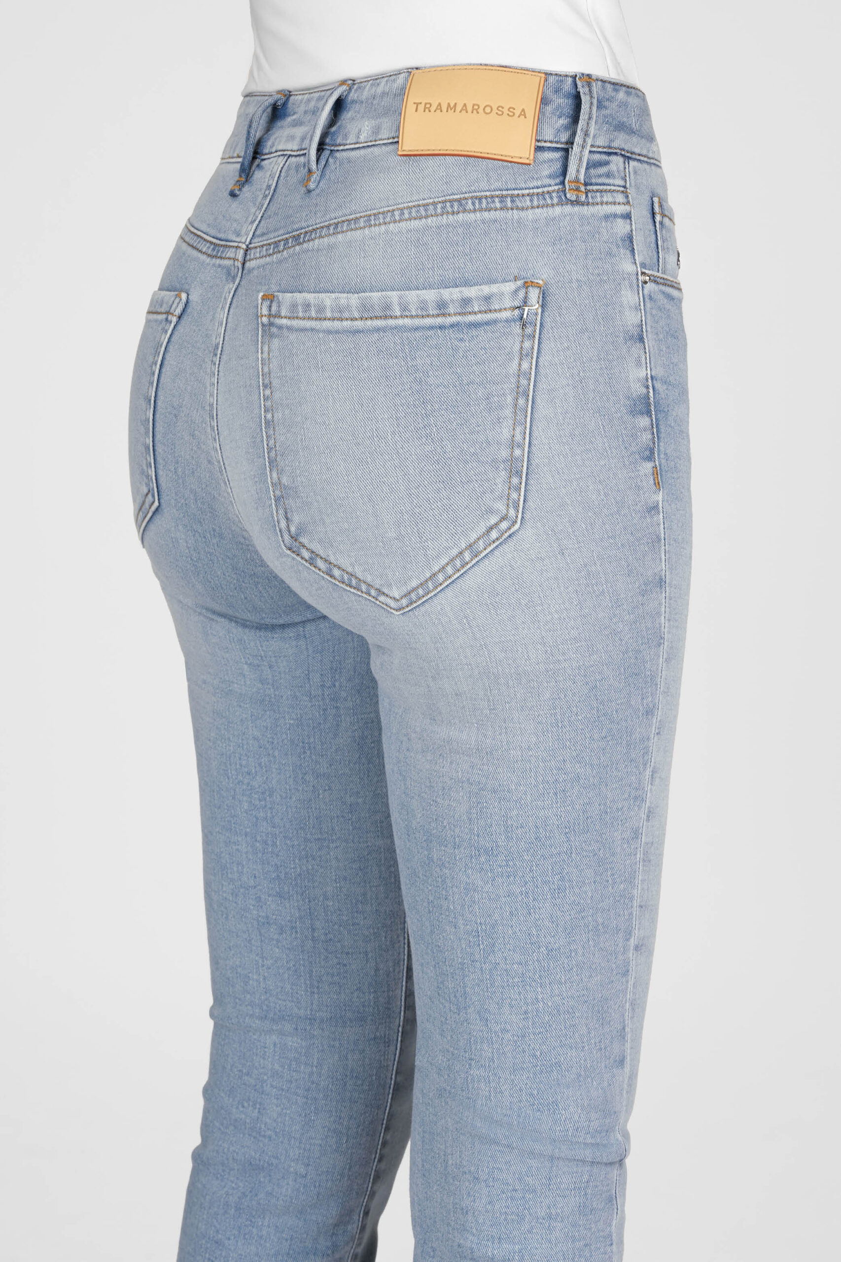 Un jeans slim modellante, con vita media e gamba super avvolgente, vestibiltà che esalta la silhouette femminile. Jeans personalizzato con il lettering Tramarossa applicato sull’etichetta posteriore in pelle suede, il tag T sulla tasca posteriore destra e il ricercato bottone gioiello.