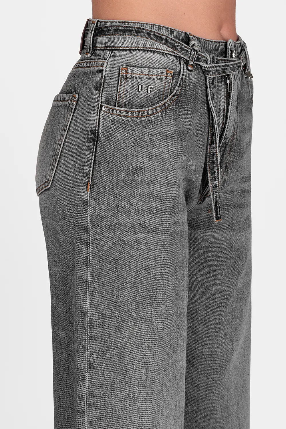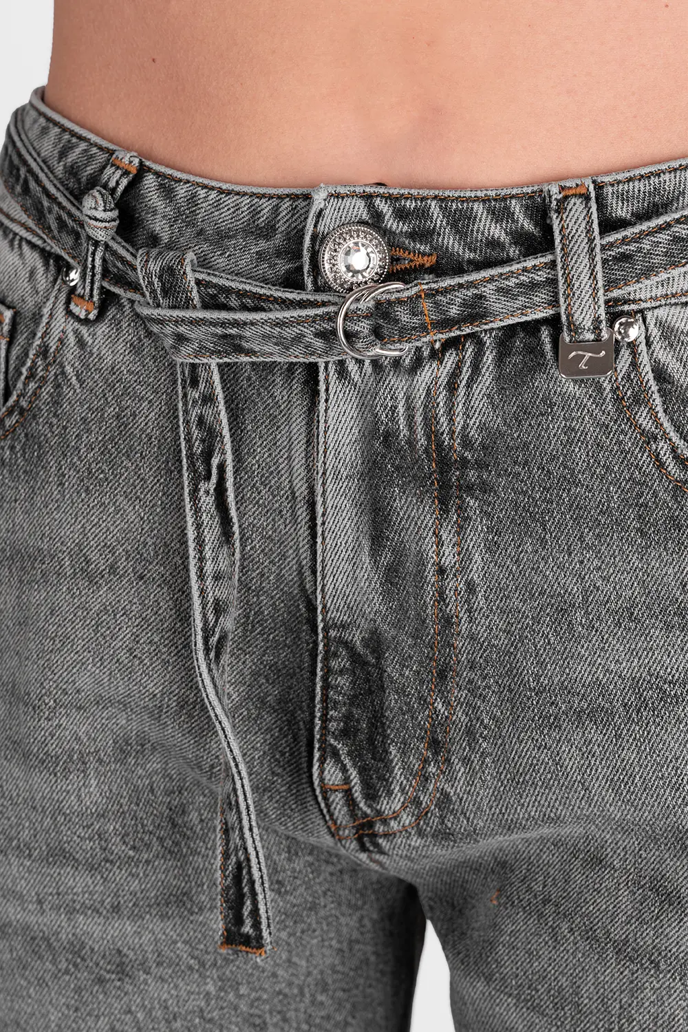 Jeans personalizzabile con le proprie iniziali. Iniziali Nikel lucido incluse. La modella è alta 1.75 e veste la taglia 27.