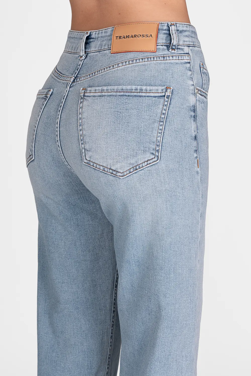 • Etichetta posteriore in pelle scamosciata e lettering Tramarossa applicato a mano