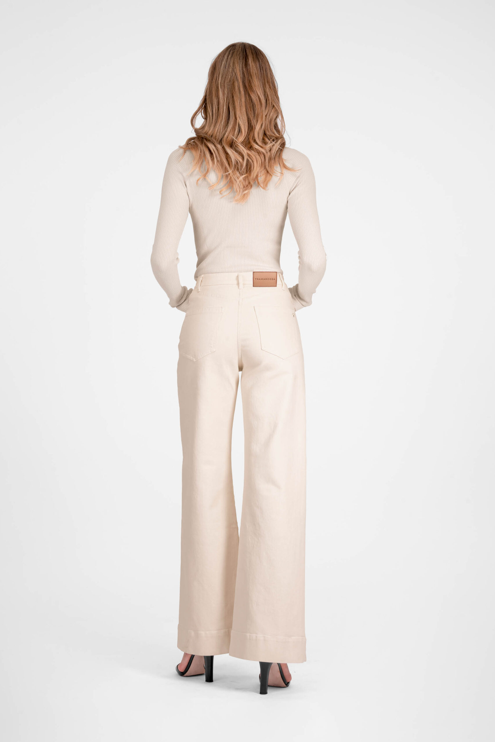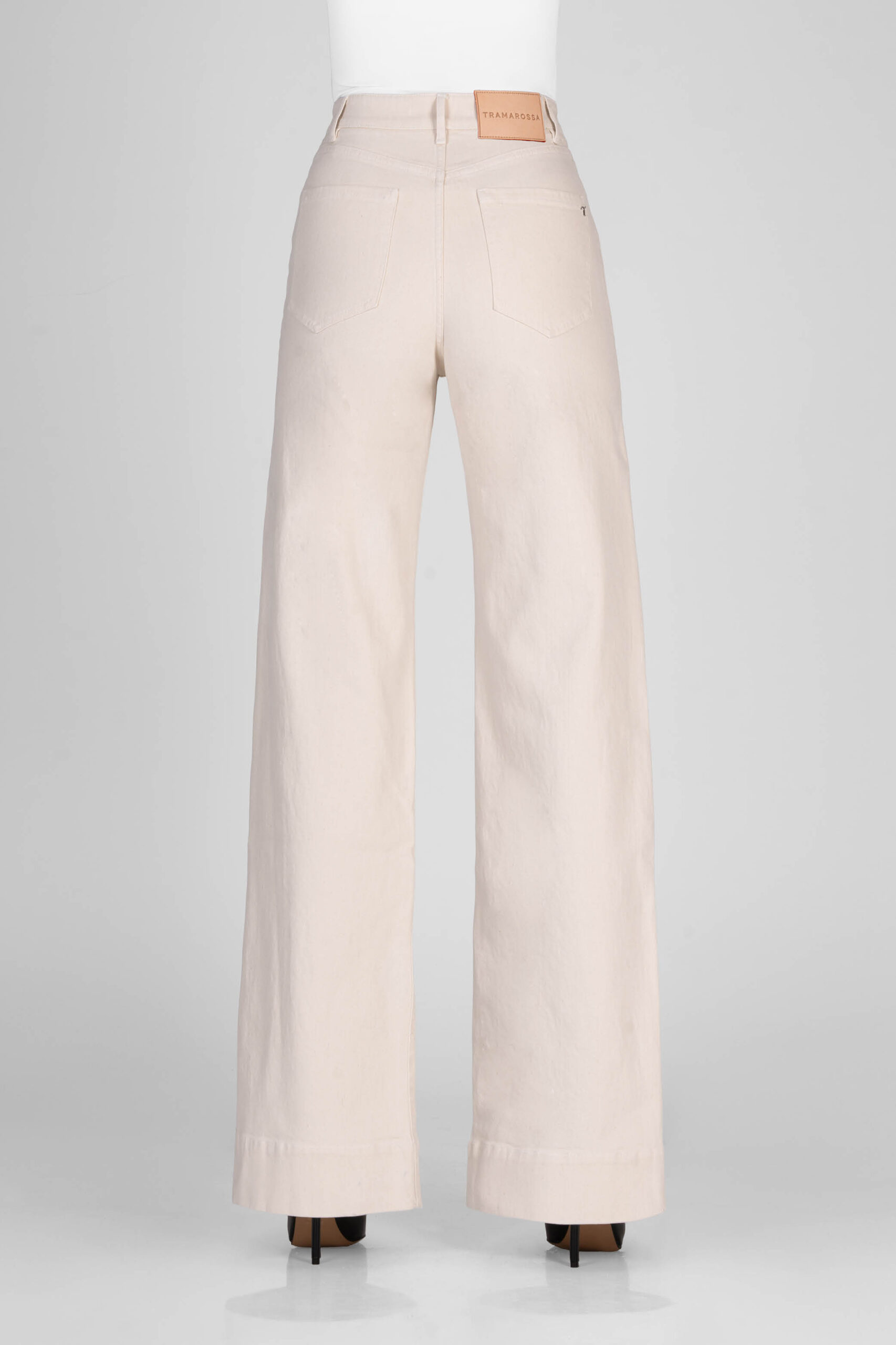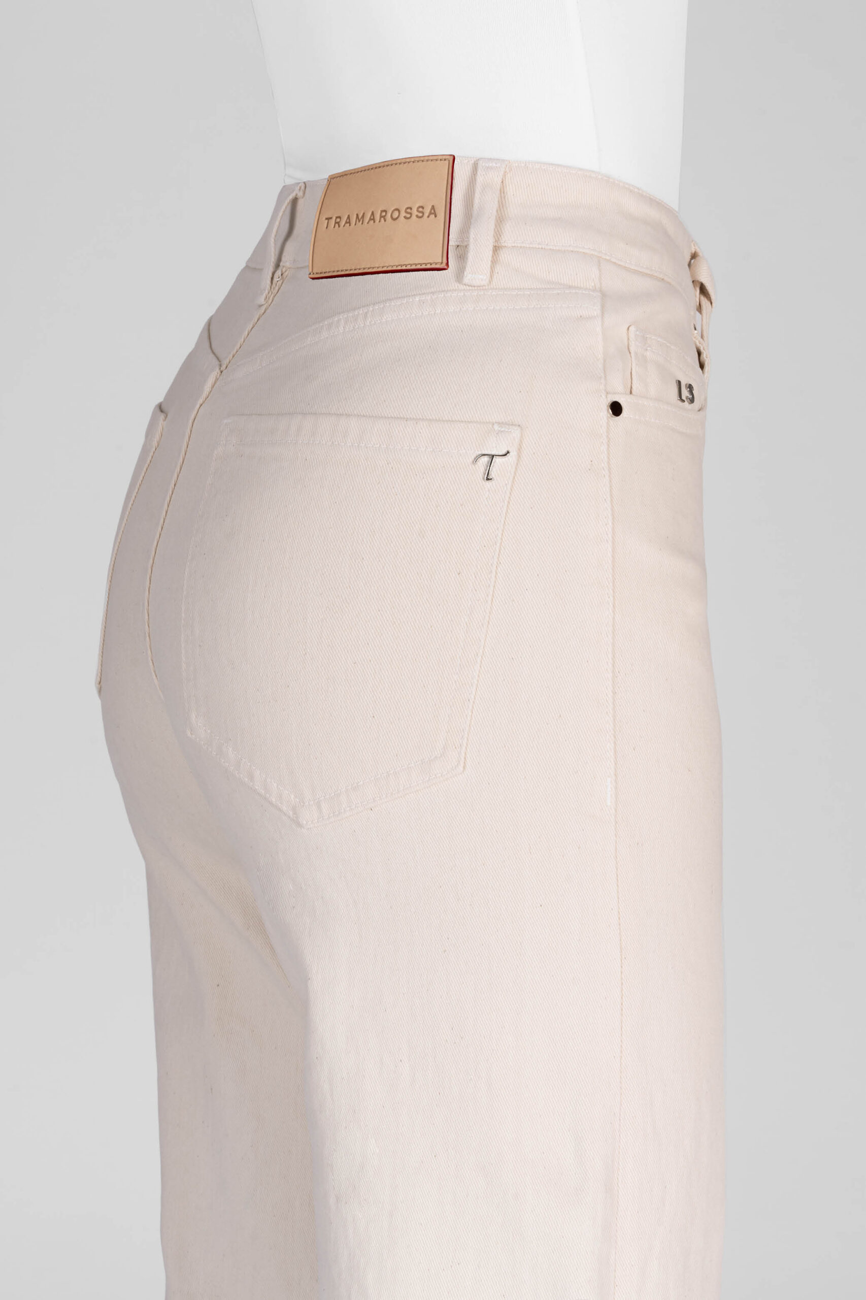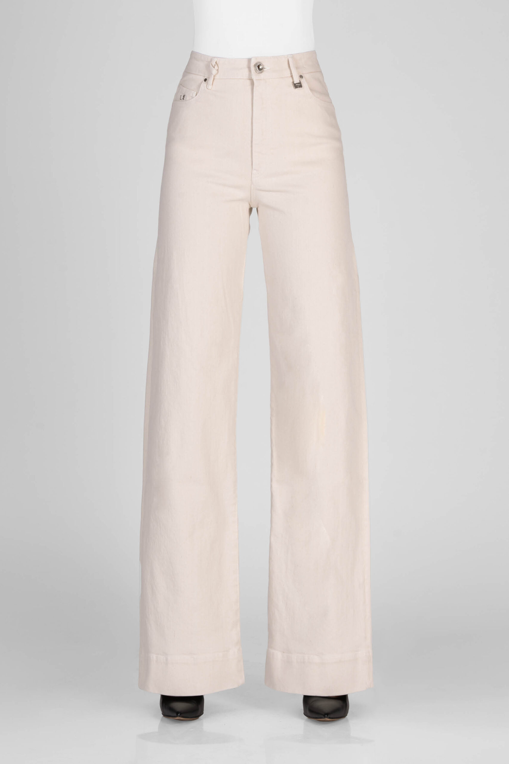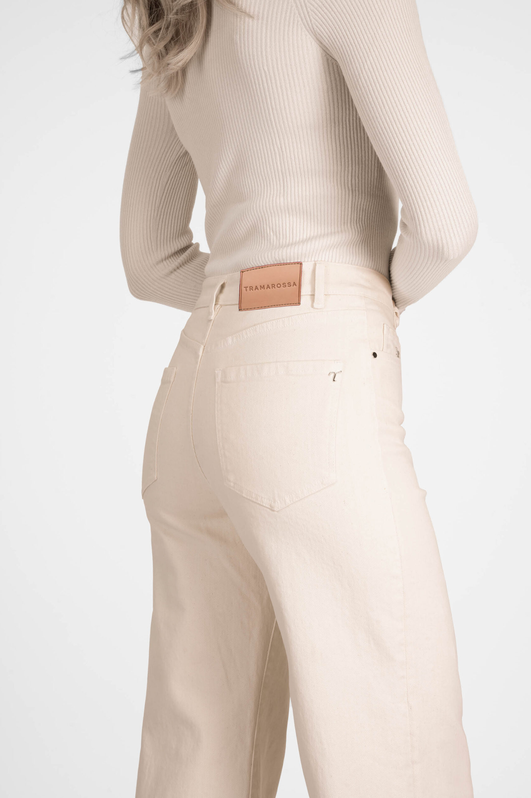 Elegante gamba larga che si apre a fiocco, con una vita medio alta. Il fondo è disegnato con un risvolto alto cucito. Il jeans è una scelta contemporanea e ricercata, è un cinque tasche comodo ed ampio realizzato su originali tele comfort che assicurano elasticità e recupero forma.