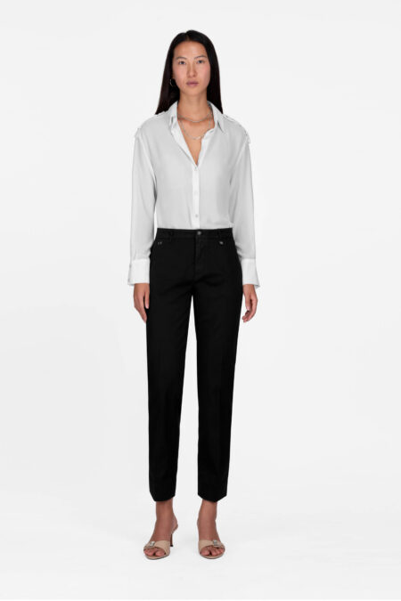 Wide-leg tailored trousers in comfort denim, America-cut front pocket and gusseted back. Contemporary fit, medium-high waistband, relaxed on the hips, wide leg at the ankle. Suede back label and hand-applied Tramarossa lettering Mock interior floral embroidery Rivet T on right back pocket Jewelled button with a diamond stone Removable metal […]